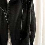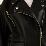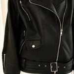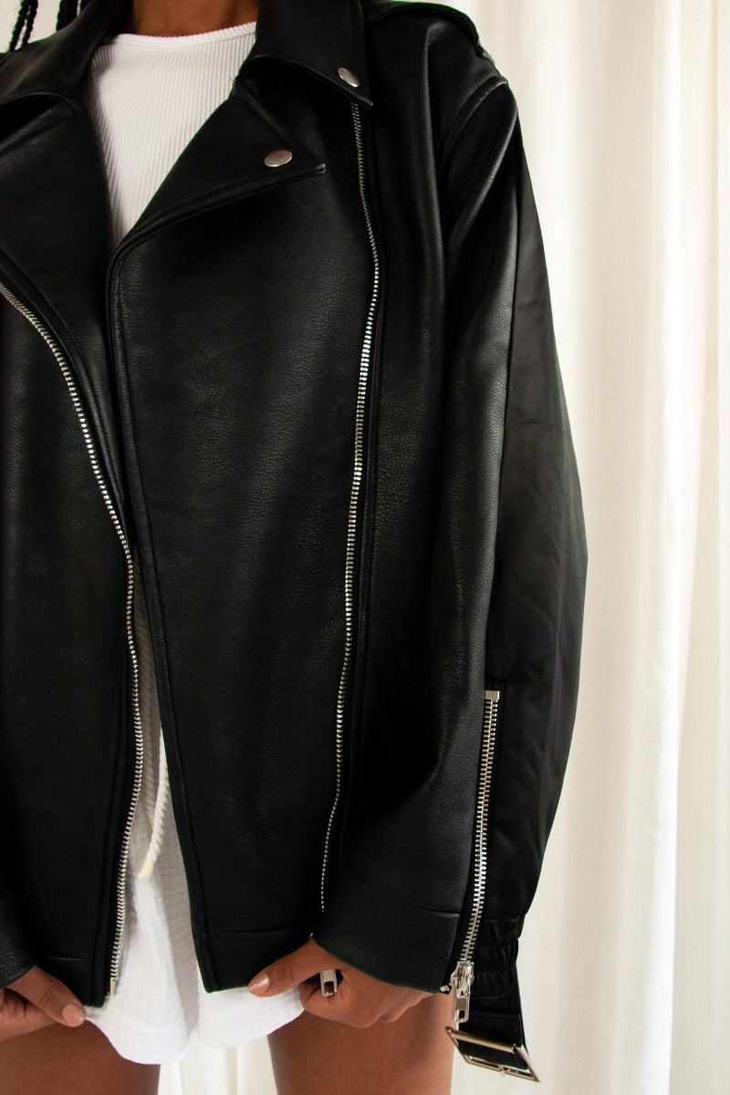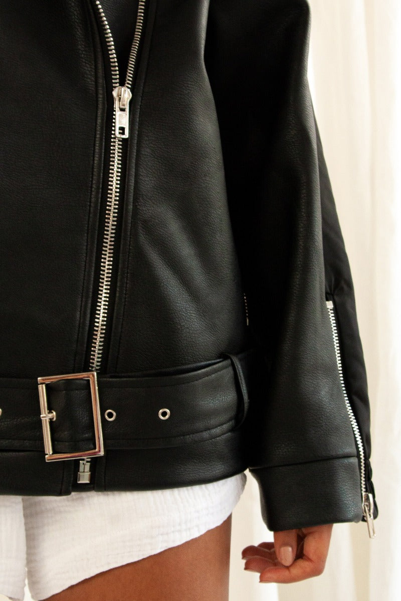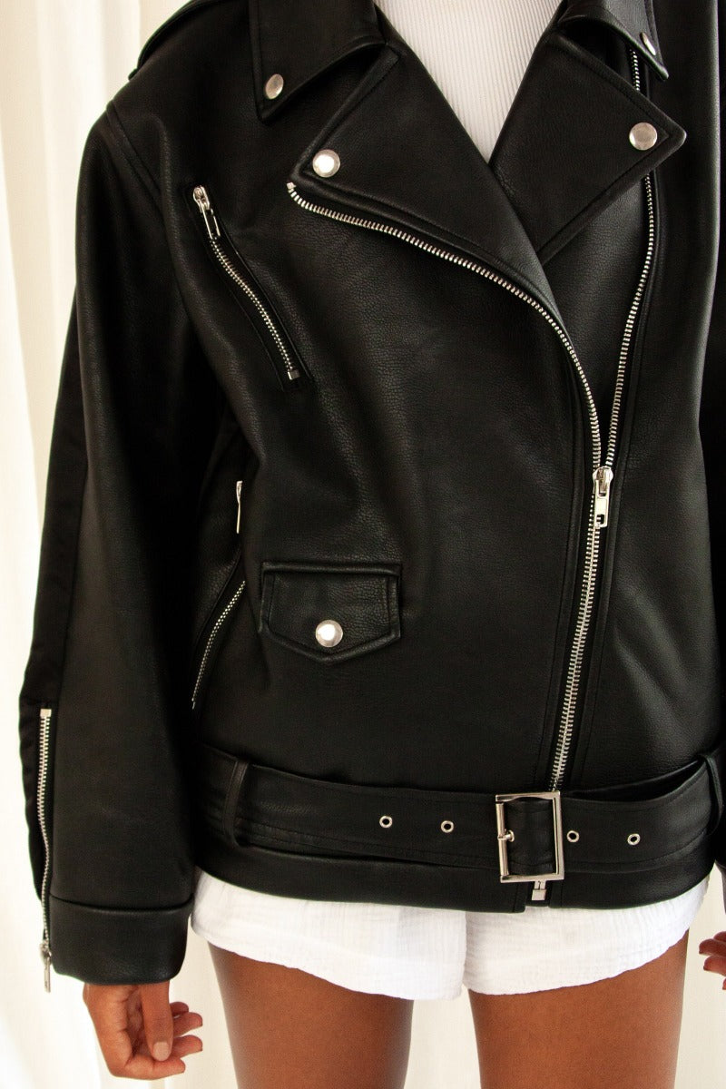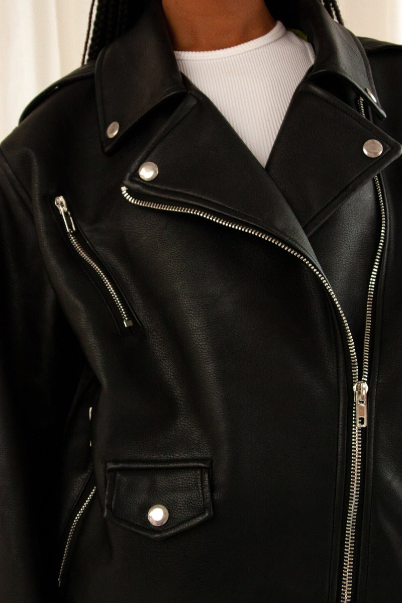 to go with everything. a hybrid of two classics, our no. 13 is the jacket you'll never stop wearing. cut from a luxe vegan leather and combined with a soft and supple nylon padded back. our unique take on the classic leather biker features dropped shoulders, silver hardware, pockets and belt. the no. 13 is an effortlessly cool, throw over any outfit jacket. fully lined and padded back for a comfortable and cosy wear.