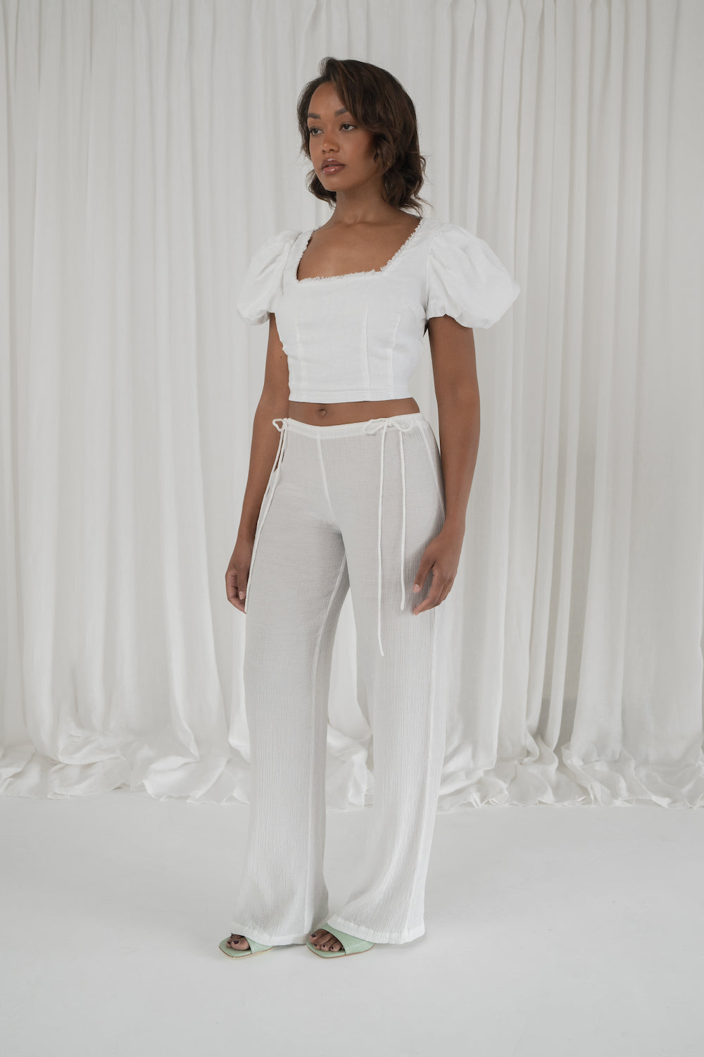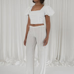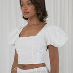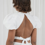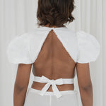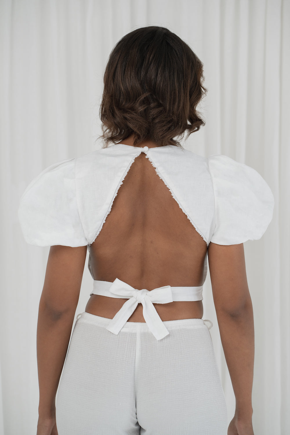 cut from 100% linen, the no. 18 top is the perfect addition to your wardrobe. it has a cropped fit with exposed seams that add an edgy feel to the delicate top. the square neckline and voluminous sleeves provide a flattering shape on the body. the back of the top features a dainty button and tie fastening that adds extra design details and is fully lined for comfort.