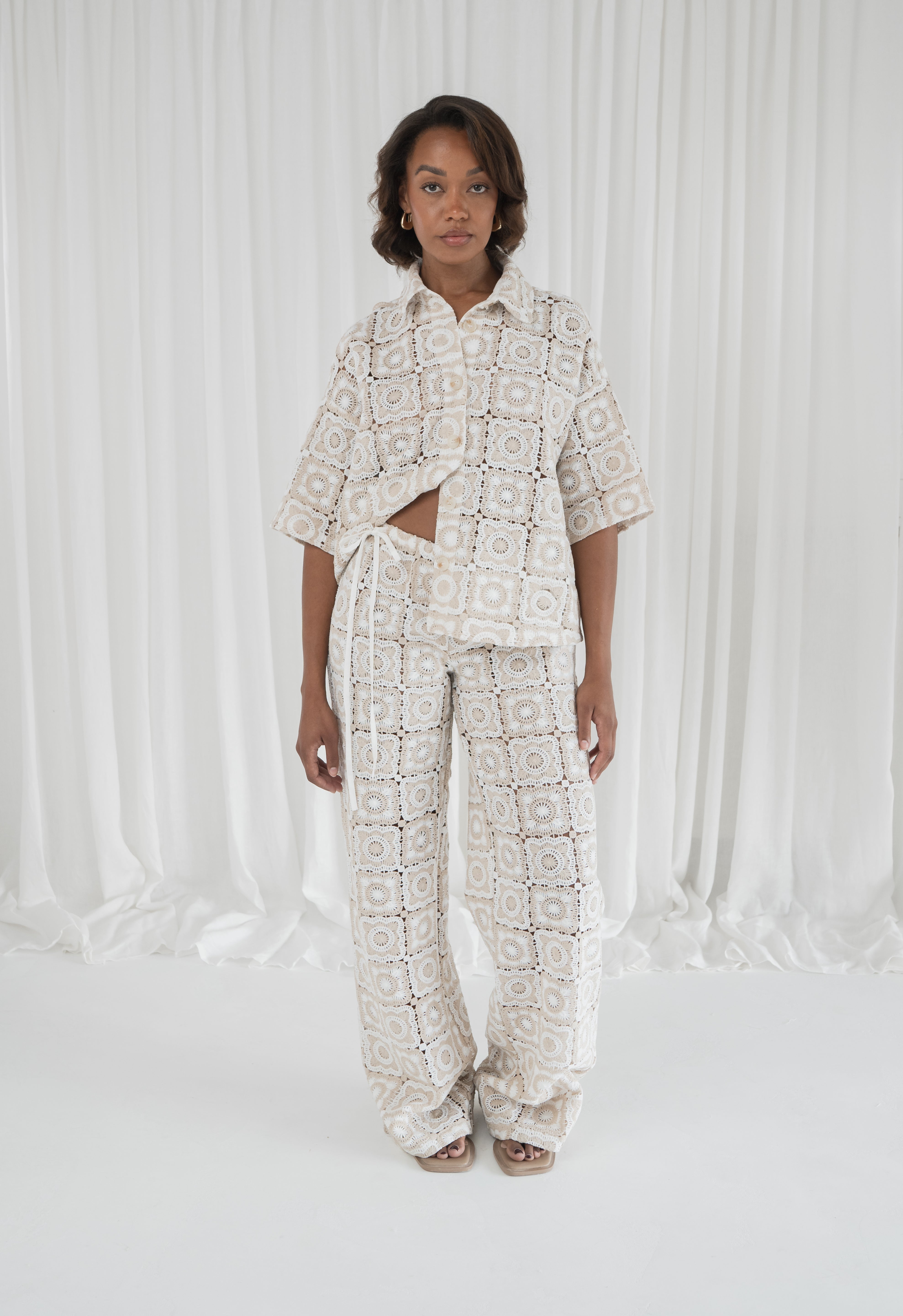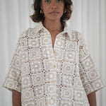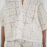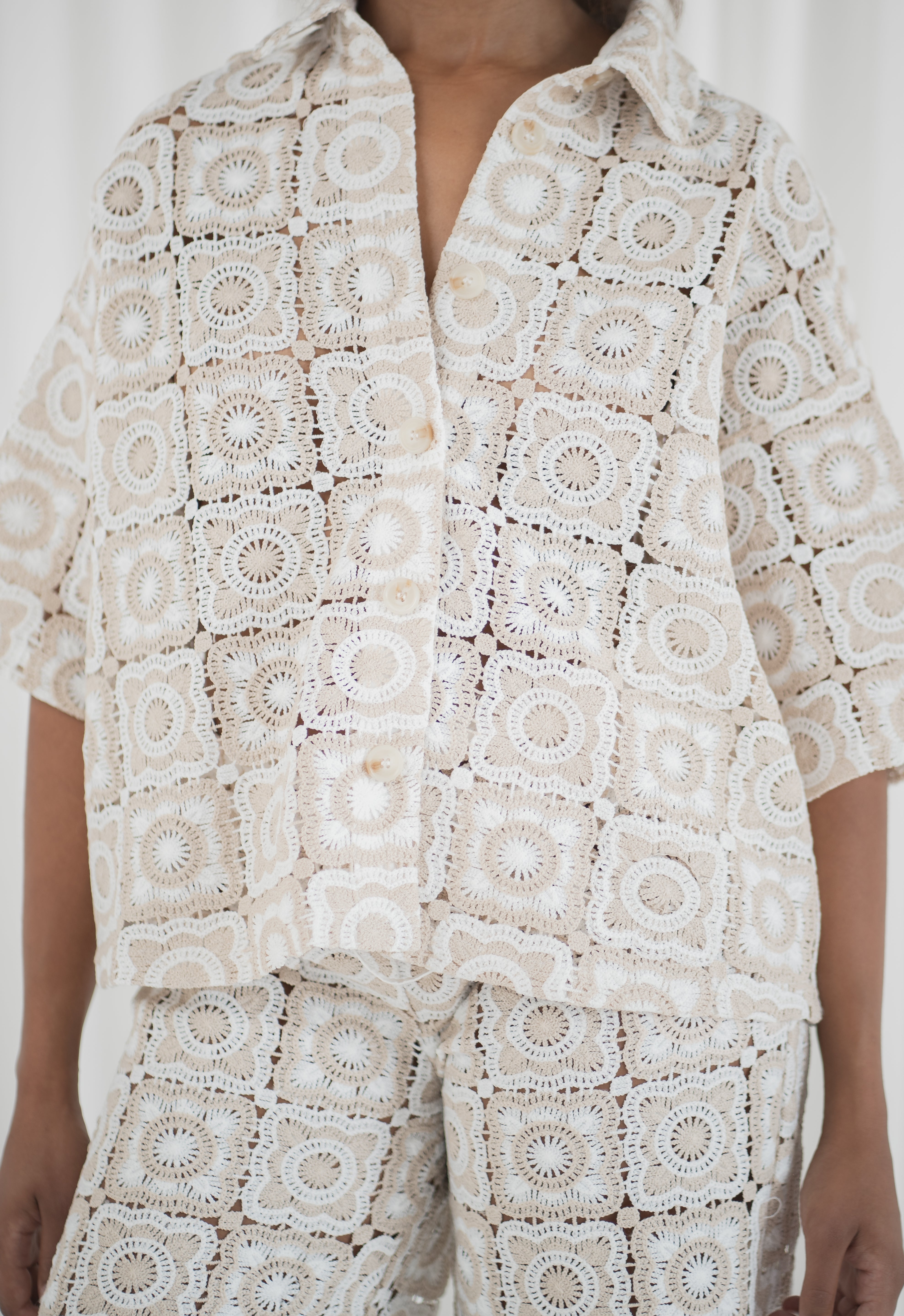 crochet is an essential for summer and this flowy crochet shirt will become a staple in your wardrobe. cut from a luxurious heavy weight crochet fabric, our no. 19 is an elevated take on a summer shirt. featuring dropped shoulders and classic collar with a tortoise button fastening in a flowy shape for an oversized relaxed silhouette. the sheer fabric makes it the perfect cover up and is paired perfectly with our matching no. 20 crochet trousers.