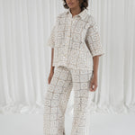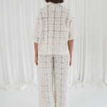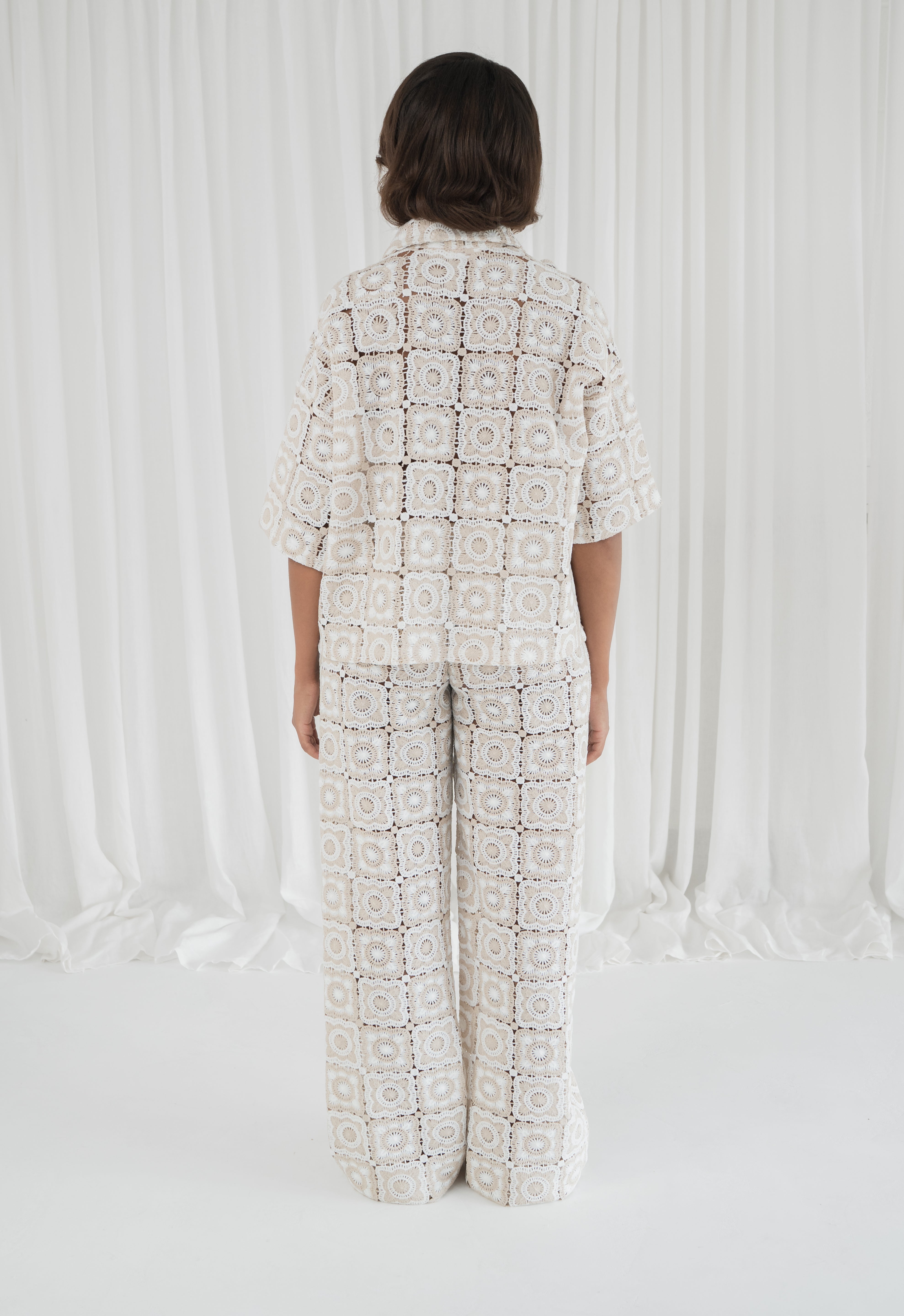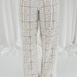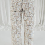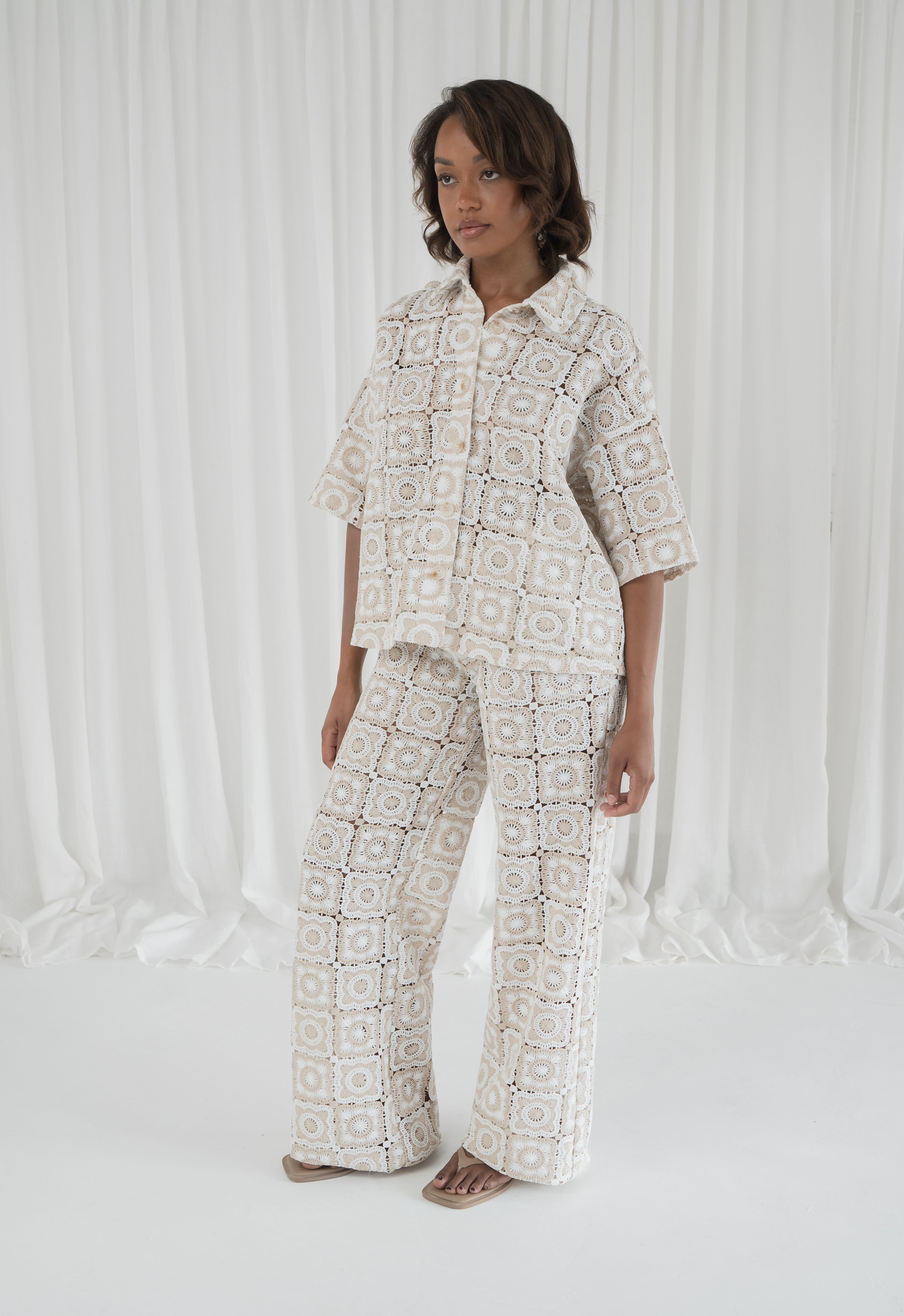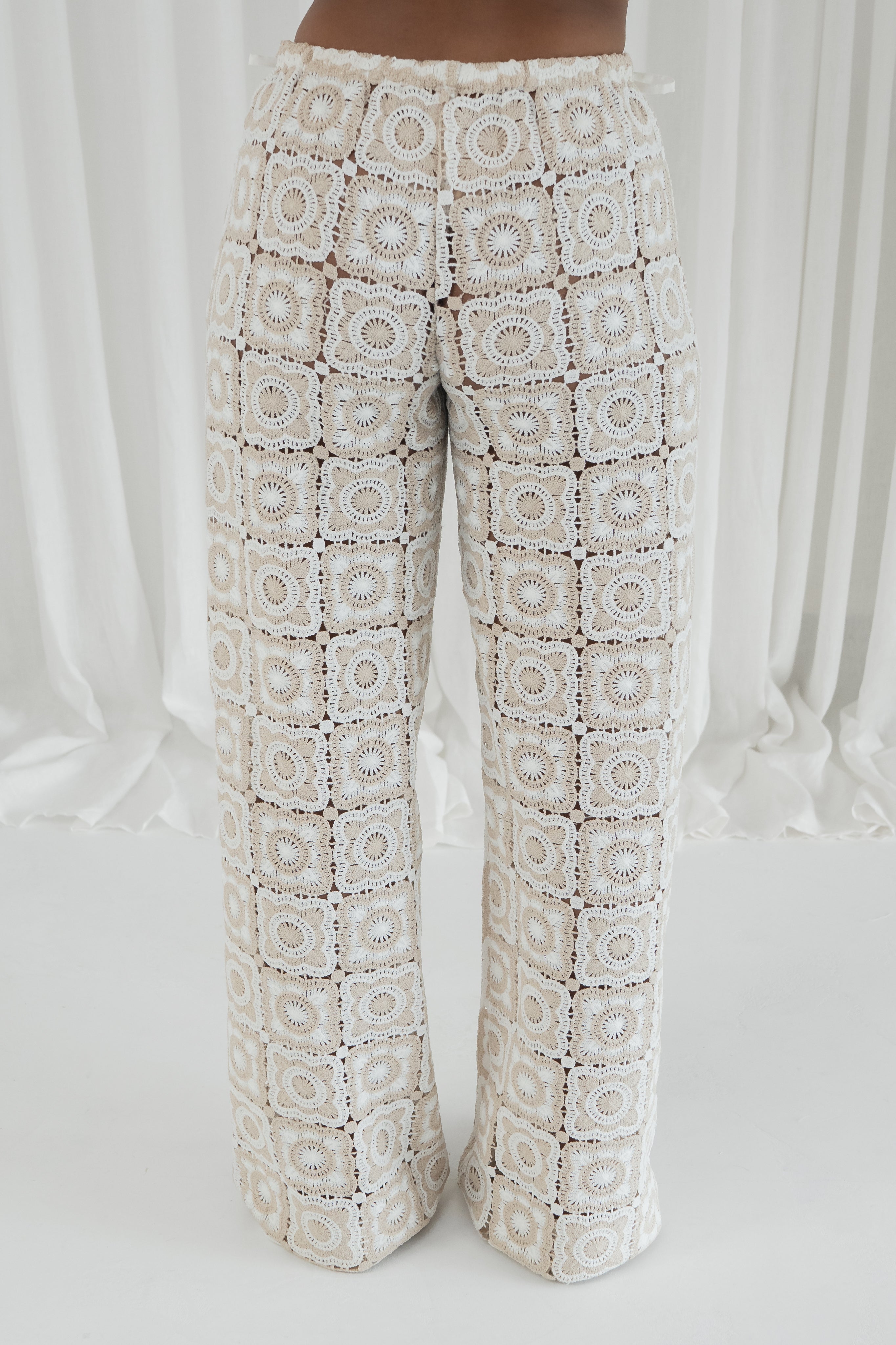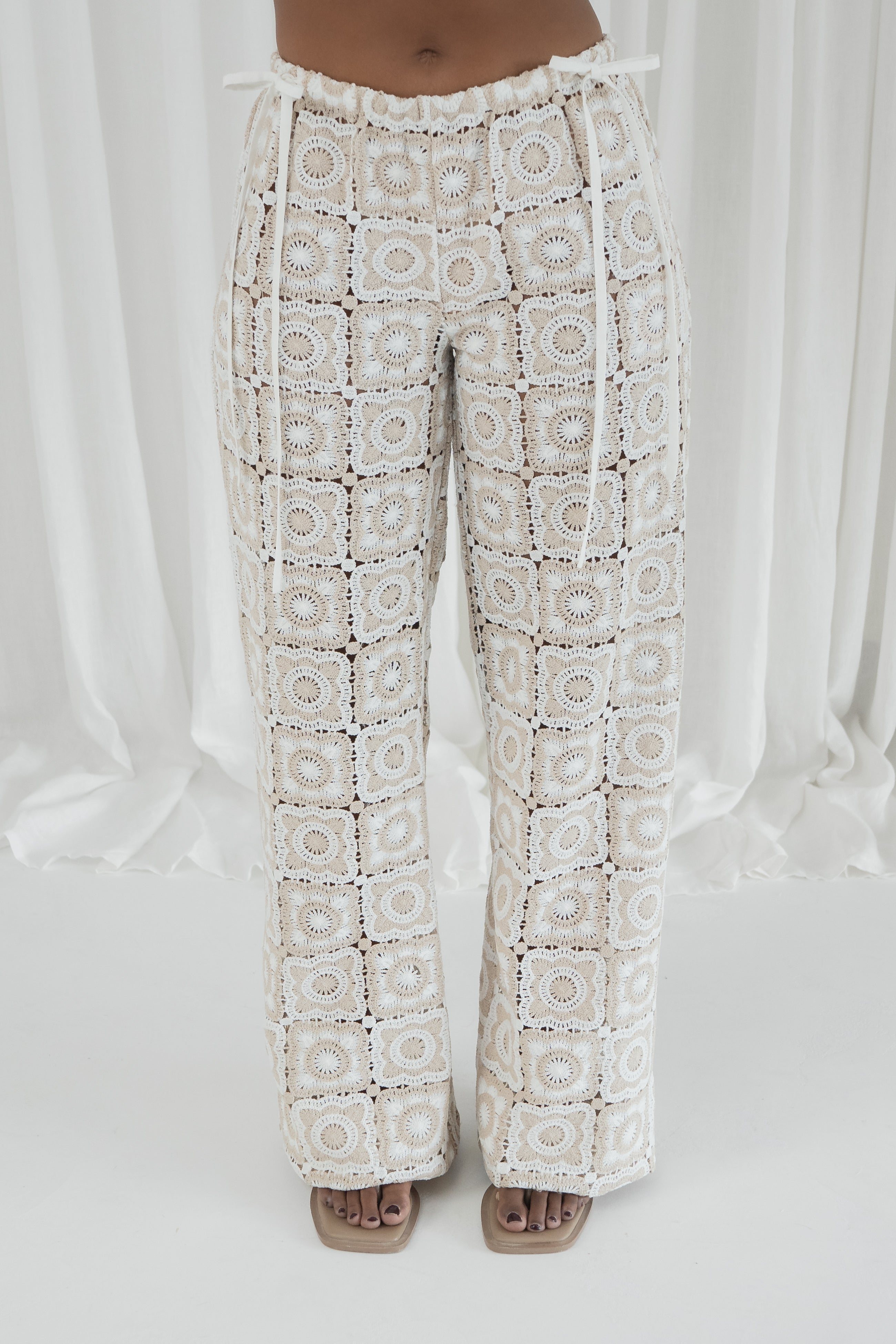 cut from luxurious heavy weight fabric, our no. 20 trousers make the perfect summer statement. the fabric features alternating nude and white floral pattern and makes the perfect cover up pants. we love the tie waistband feature that double as an adjustable fastening and dainty design detail. designed to sit mid rise but interchangeable to sit low rise or high waist. team with our no. 19 shirt for an instant outfit as it was designed to be.