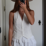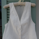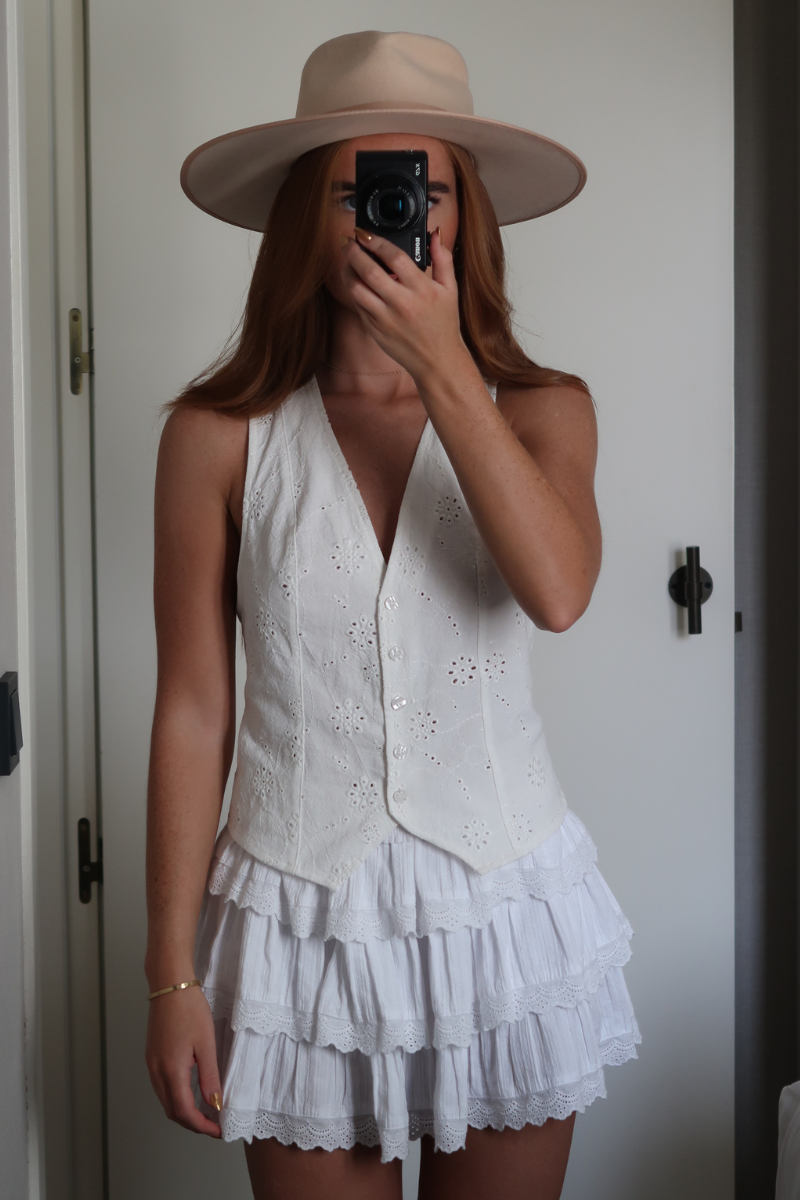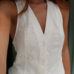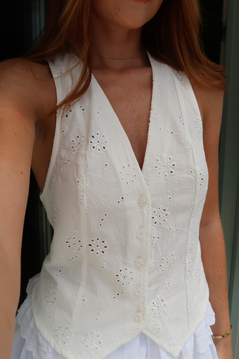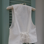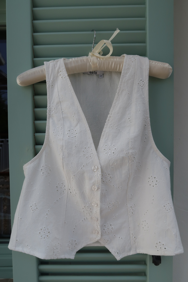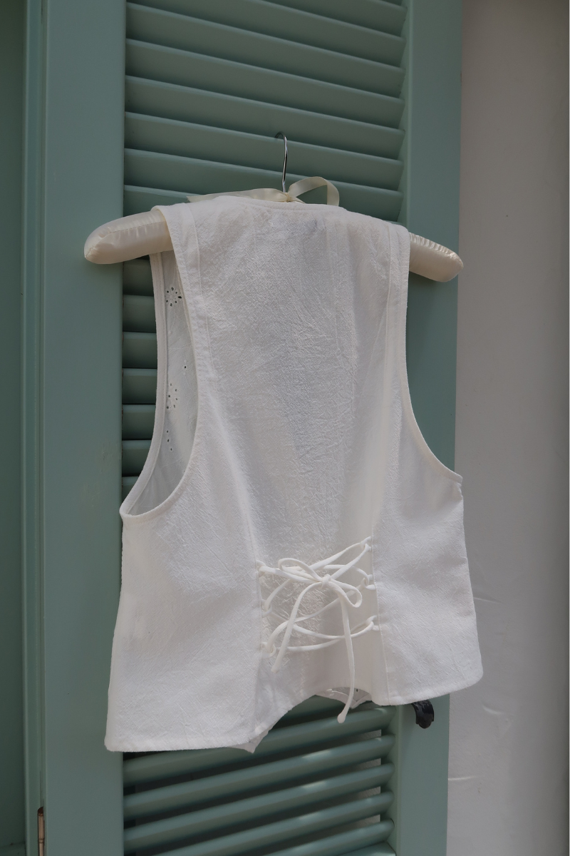 we love the feminine feel of the no. 22 tailored waistcoat. the attention to detail elevates this classic wardrobe staple. cut from a hand embroidered 100% cotton fabric and featuring classic button fastening. the plunge neckline and tie fastening at the back creates a flattering silhouette whilst the soft to touch fabric makes it feel super comfortable on the body. this is perfectly paired with our no. 10 skirt as it features similar broderie anglaise detailing.