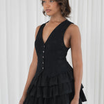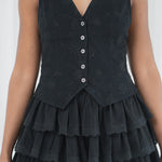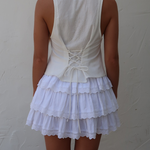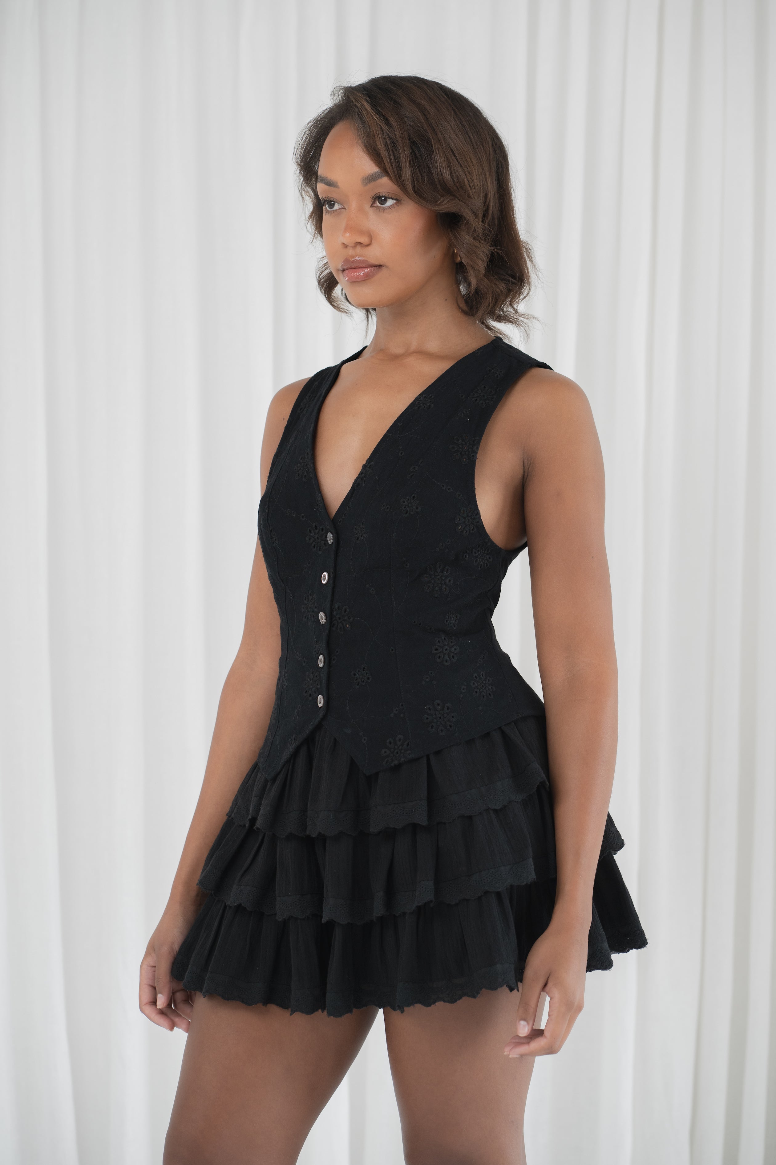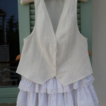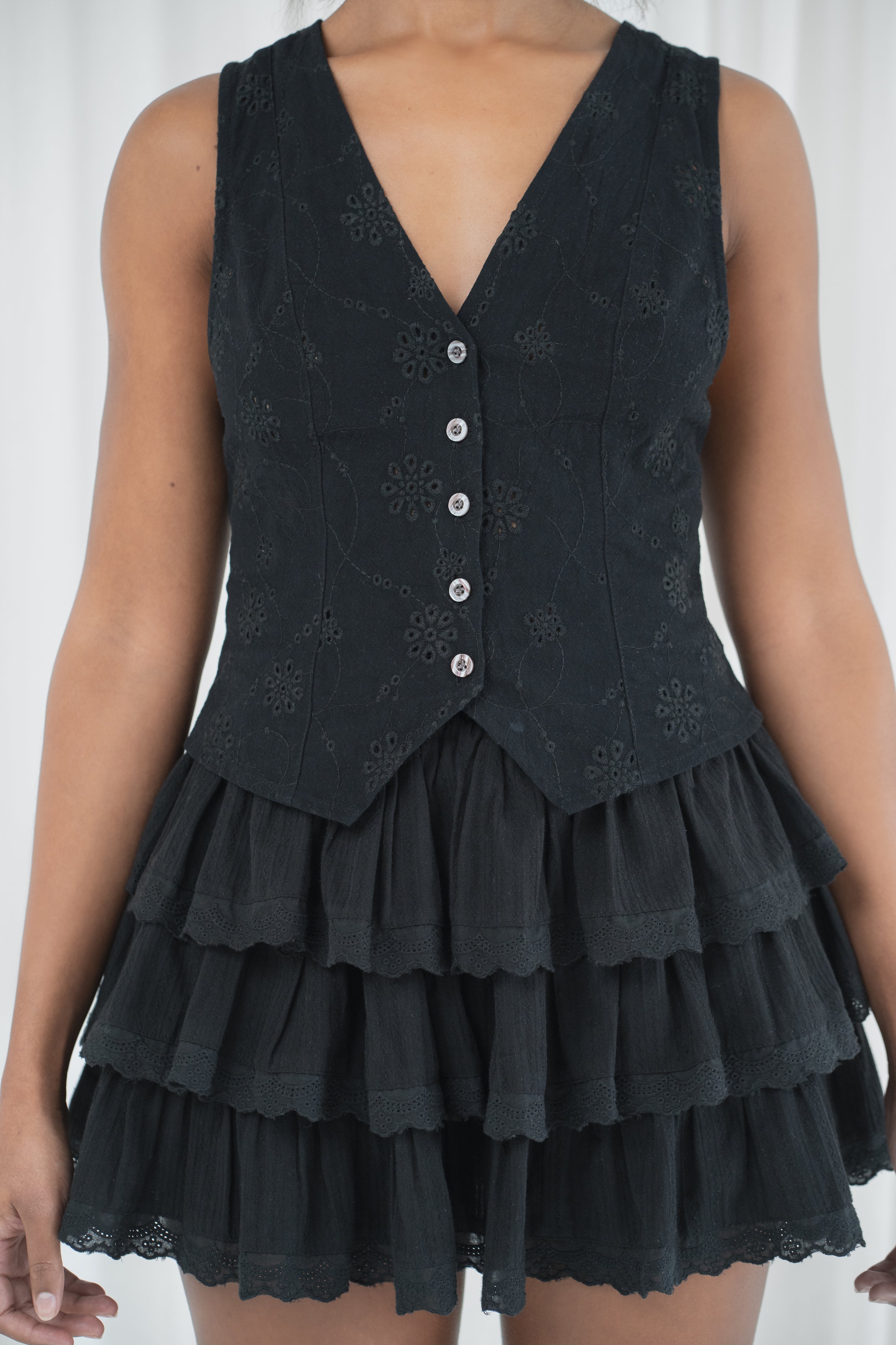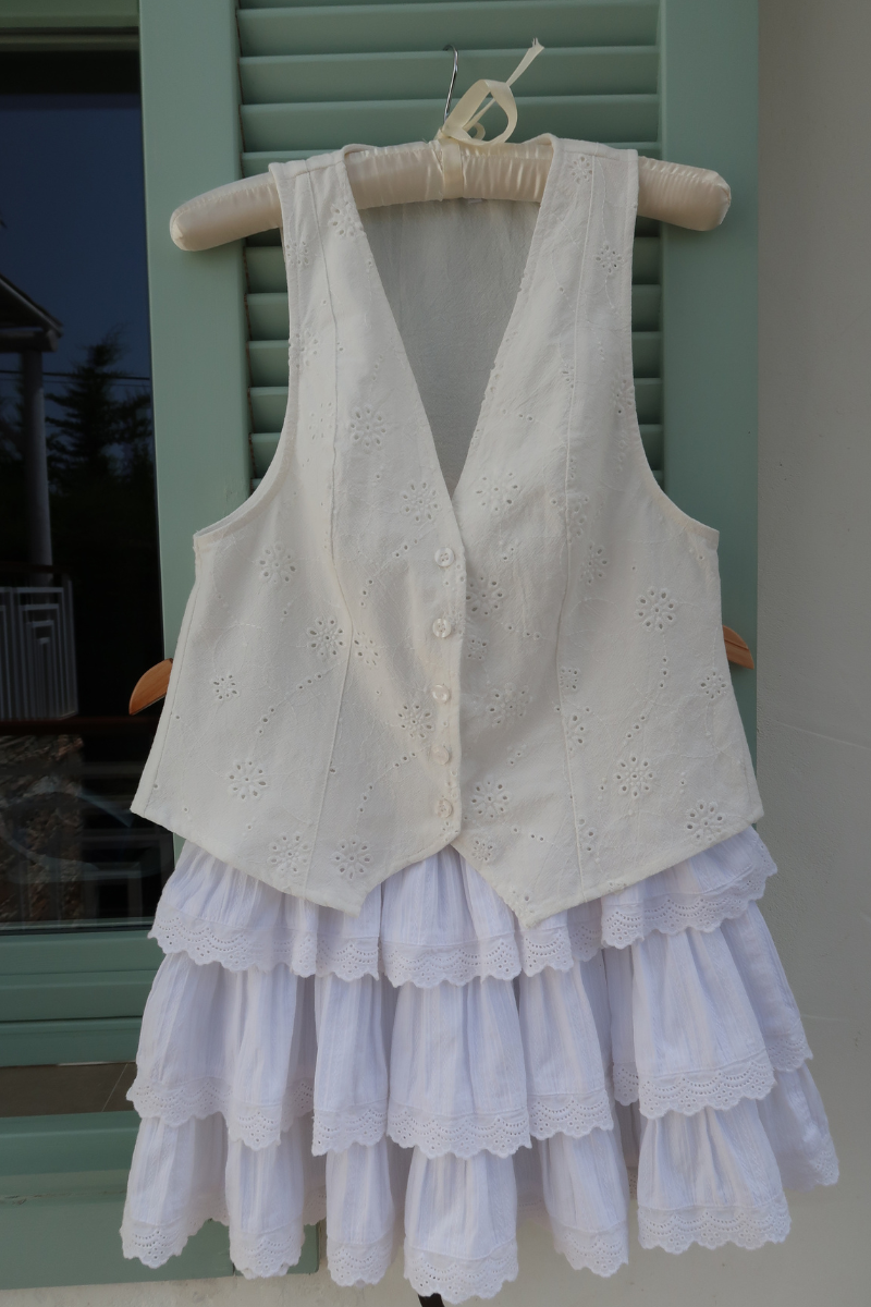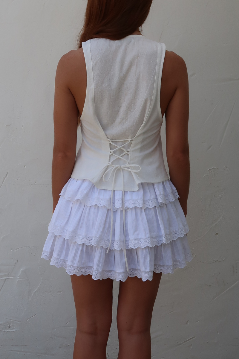 we love the feminine feel of the no. 22 tailored waistcoat. the attention to detail elevates this classic wardrobe staple. cut from a hand embroidered 100% cotton fabric and featuring classic button fastening. the plunge neckline and tie fastening at the back creates a flattering silhouette whilst the soft to touch fabric makes it feel super comfortable on the body. this is perfectly paired with our no. 10 skirt as it features similar broderie anglaise detailing.