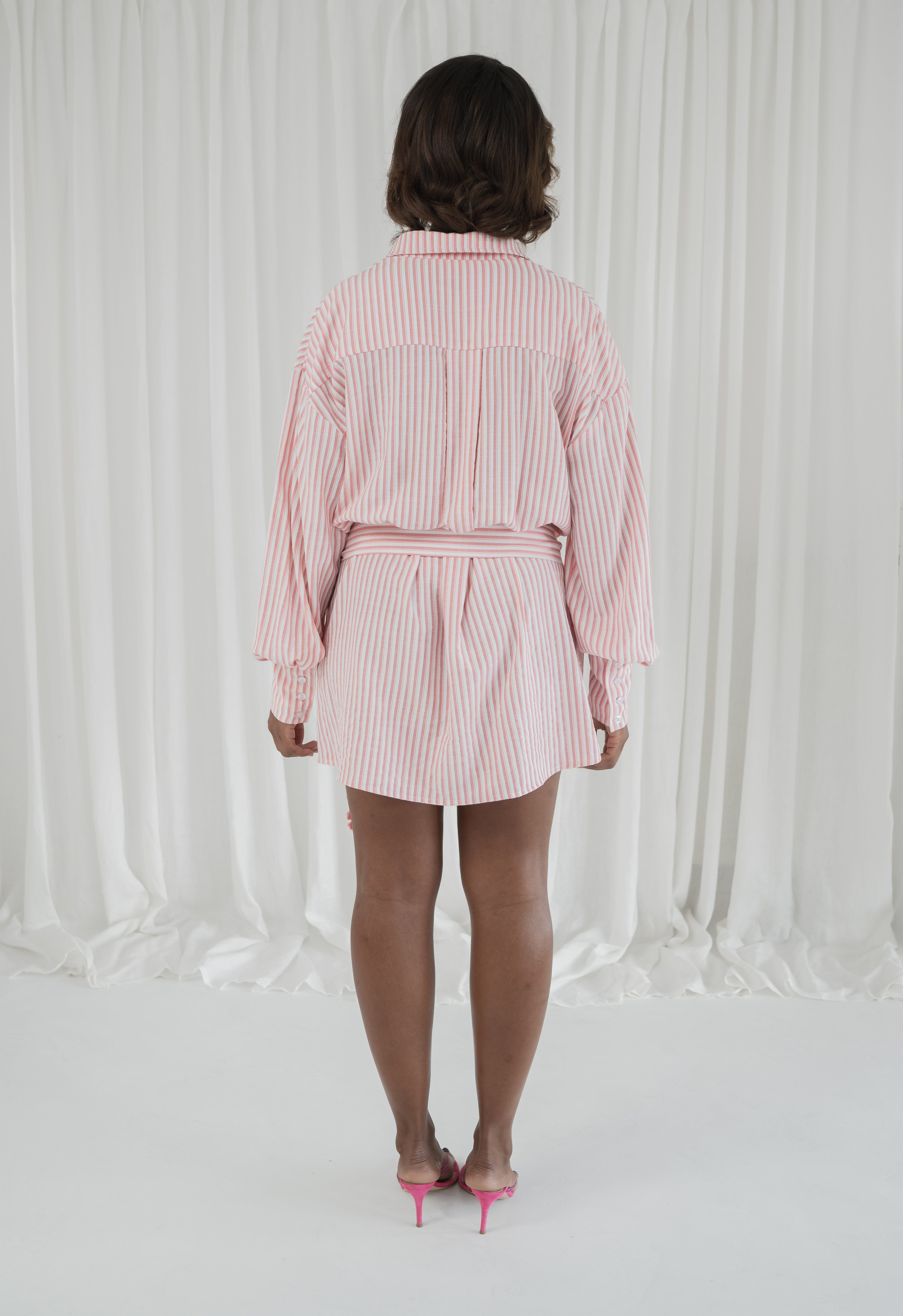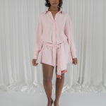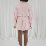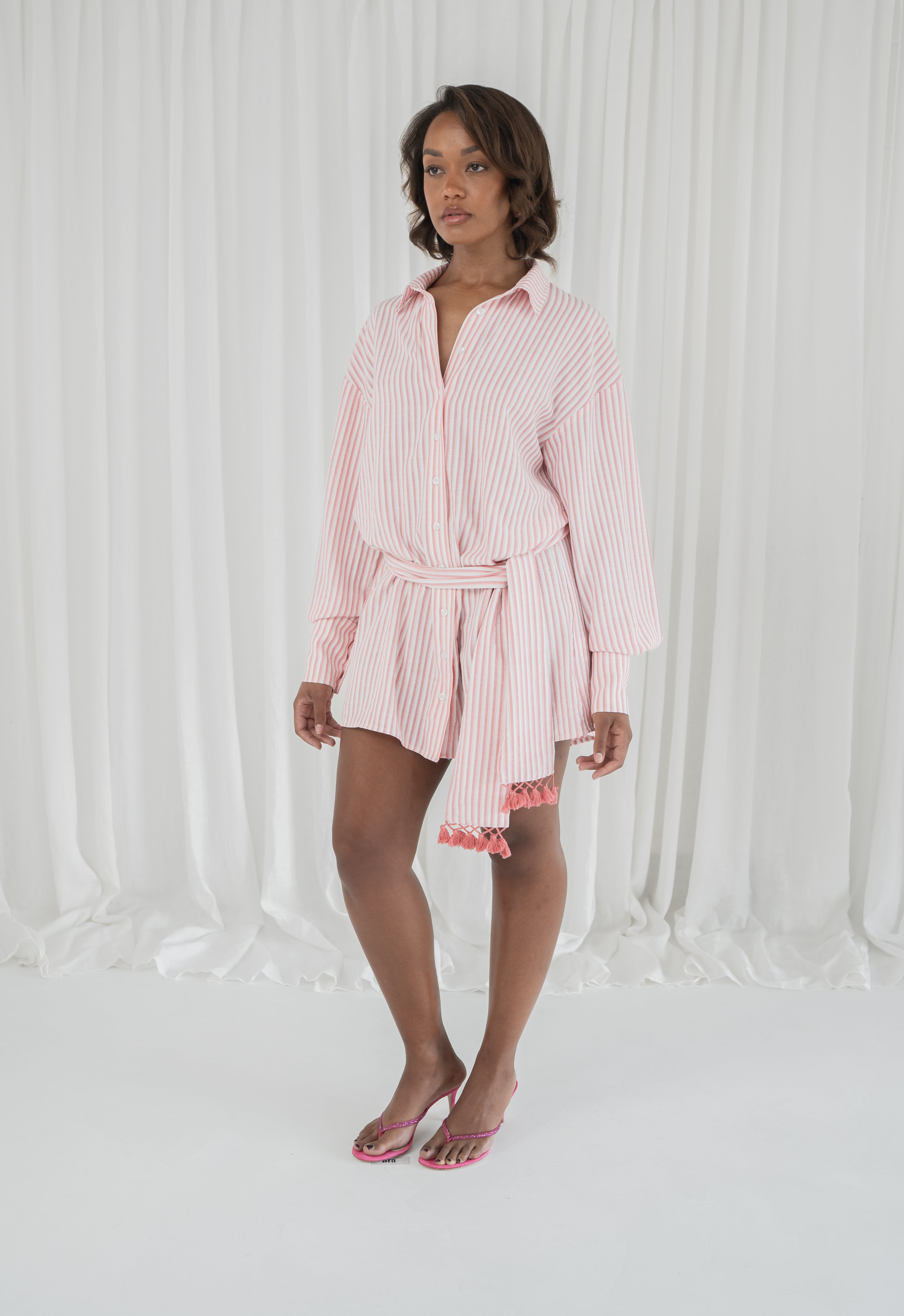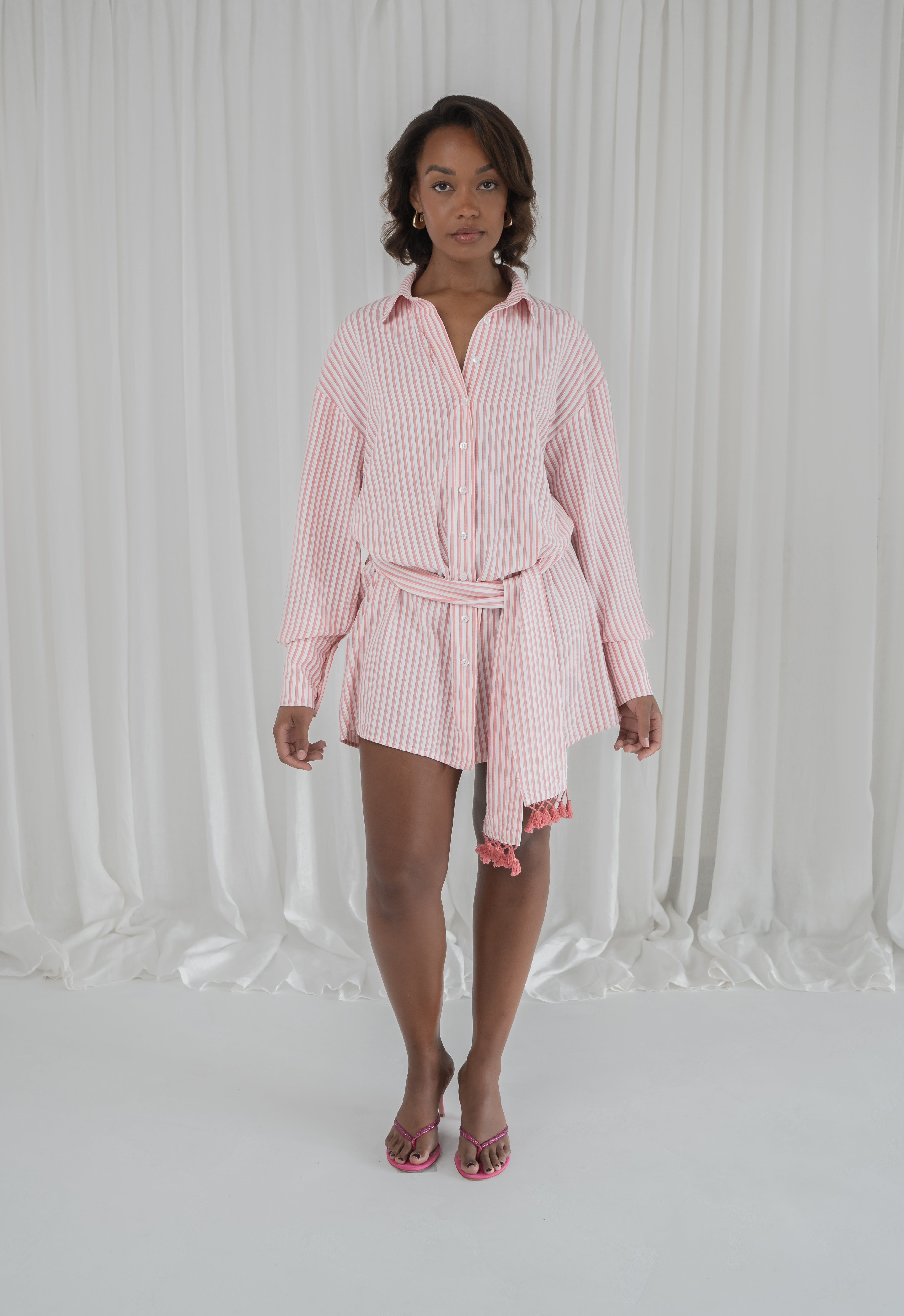 the ultimate fling on and go shirt. our no. 5 shirt reimagined and designed with effortless, endless outfits in mind. made from a breathable cotton material for a luxury fit and feel. the length is suitable to wear on its own as a dress or as a layering piece transitioning into autumn. inspired by menswear fit, we wanted to give the option of cinching the waist with the fringe belt to add a feminine touch. truly androgynous, truly dula.